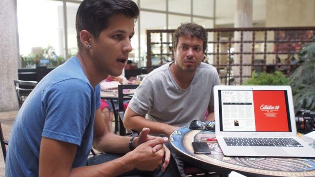 《Vistar》興辦者兼構思總監(jiān)羅賓·佩德拉加(左)和他的兄弟、AlaMesa聯(lián)合創(chuàng)始人揚戴爾·古鐵雷斯?!禫istar》是有關古巴年青人文明的電子雜志,AlaMesa是有關古巴飯館的網(wǎng)站和移動運用。