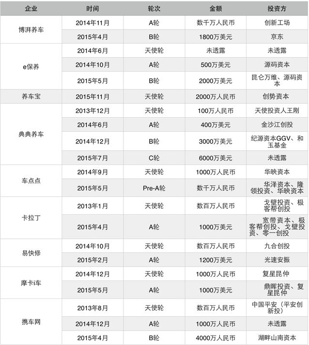 從圖中能夠看出,2014年下半年至2015年上半年,養(yǎng)護(hù)O2O公司迎來(lái)風(fēng)口,很多本錢(qián)和創(chuàng)業(yè)者涌入這個(gè)職業(yè),以上9家養(yǎng)護(hù)O2O均在此時(shí)間段內(nèi)取得了1輪或2輪的融資。博湃養(yǎng)車(chē)在拿到B輪融資后乃至對(duì)外高調(diào)表明2015年下半年敞開(kāi)決戰(zhàn),吃下全部轎車(chē)后效勞商場(chǎng),并方案2016年年末掩蓋100個(gè)城市,招聘1萬(wàn)名技師。