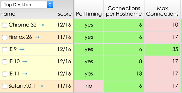 上圖展現(xiàn)了各瀏覽器的并行銜接數(shù)(同域名),能夠看到在一些現(xiàn)代瀏覽器內(nèi)每個(gè) hostname 的最大銜接數(shù)根本都是6個(gè),IE 稍顯傲嬌,總體而言并發(fā)數(shù)不高。 所以 PC 年代對(duì)靜態(tài)資本優(yōu)化時(shí),通常將靜態(tài)資本散布在幾個(gè)不一樣域,確保資本最完美地分域名存儲(chǔ),以供給最大并行度,讓客戶端加載靜態(tài)資本更為敏捷。